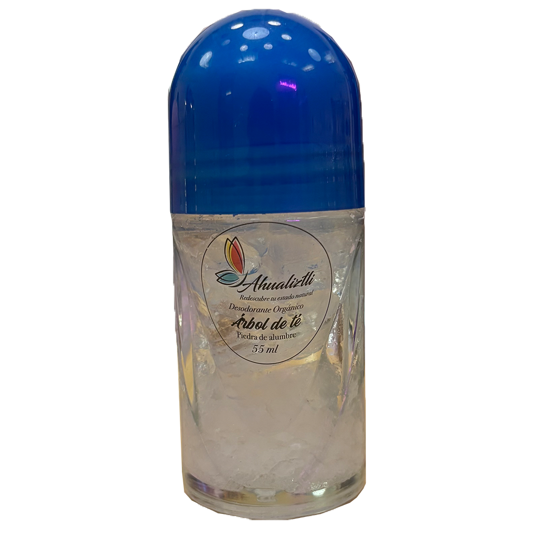 Desodorante roll on a base de piedra de alumbre. Apropiado para todo tipo de PH. Contiene piedra de alumbre que elimina el mal olor y bacterias que pudieran existir. Esencia natural unisex de árbol de té. Además, el envase es reutilizable, se puede abrir y rellenar con agua destilada o piedra de alumbre según se terminen los ingredientes en un tiempo estimado de 4 a 6 meses. Contenido: 55ml.